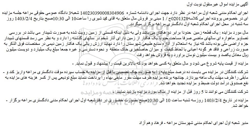 - مزایده در تاریخ 1403/2/4 روزسه شنبه ساعت 10 الی 10:30صبح بصورت حضوری در دفترشعبه اول اجرای احکام مدنی دادگستری مراغه برگزار خواهد شد.