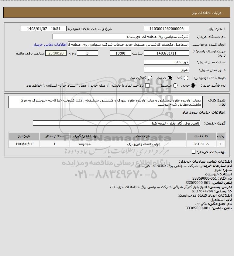 نام دستگاه خریدار:شرکت سهامی برق منطقه ای خوزستان