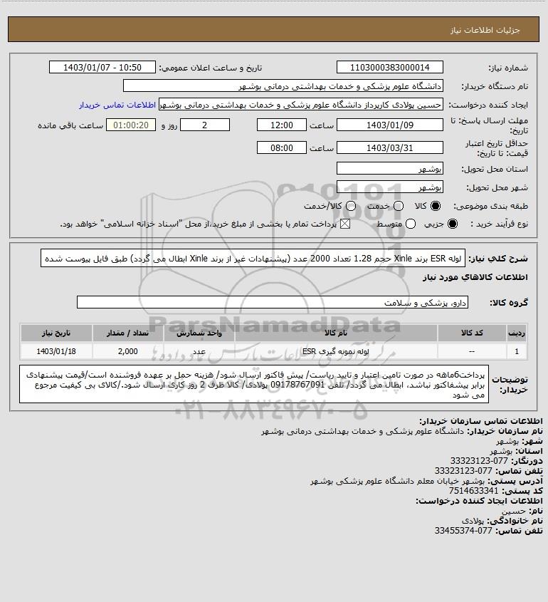 شرح کلی نیاز: لوله ESR برند Xinle حجم 1.28 تعداد 2000 عدد (پیشنهادات غیر از برند Xinle ابطال می گردد) طبق فایل پیوست شده