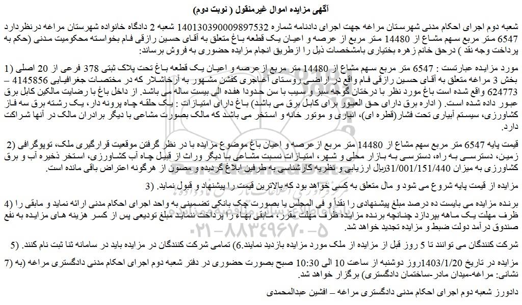 شعبه دوم اجرای احکام مدنی شهرستان مراغه جهت اجرای دادنامه شماره 140130390009897532 شعبه 2 دادگاه خانواده شهرستان مراغه درنظردارد 6547 متر مربع سهم مشاع از 14480 متر مربع از عرصه و اعیان یک قطعه باغ متعلق به آقای حسین رازقی فام بخواسته محکومیت مدنی (حکم به پرداخت وجه نقد ) درحق خانم زهره بختیاری بامشخصات ذیل را ازطریق انجام مزایده حضوری به فروش برساند:
