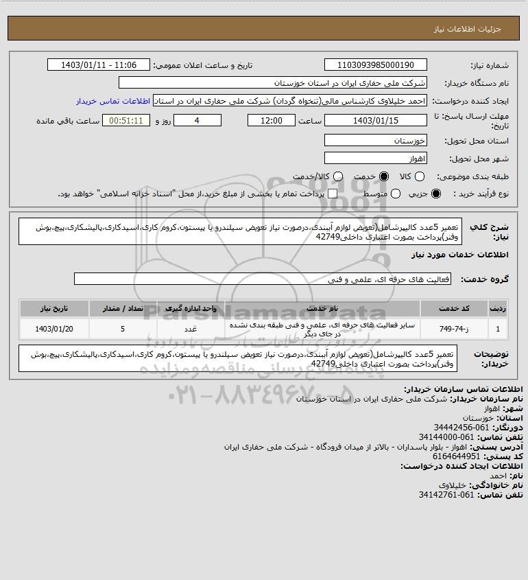 شرح کلی نیاز: تعمیر 5عدد کالیپرشامل(تعویض لوازم آببندی،درصورت نیاز تعویض سیلندرو یا پیستون،کروم کاری،اسیدکاری،پالیشکاری،پیچ،بوش وفنر)پرداخت بصورت اعتباری داخلی42749