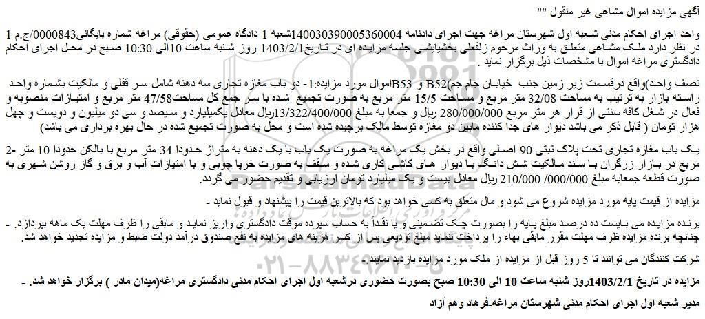 - مزایده در تاریخ 1403/2/1روز شنبه ساعت 10 الی 10:30 صبح بصورت حضوری درشعبه اول اجرای احکام مدنی دادگستری مراغه(میدان مادر ) برگزار خواهد شد.