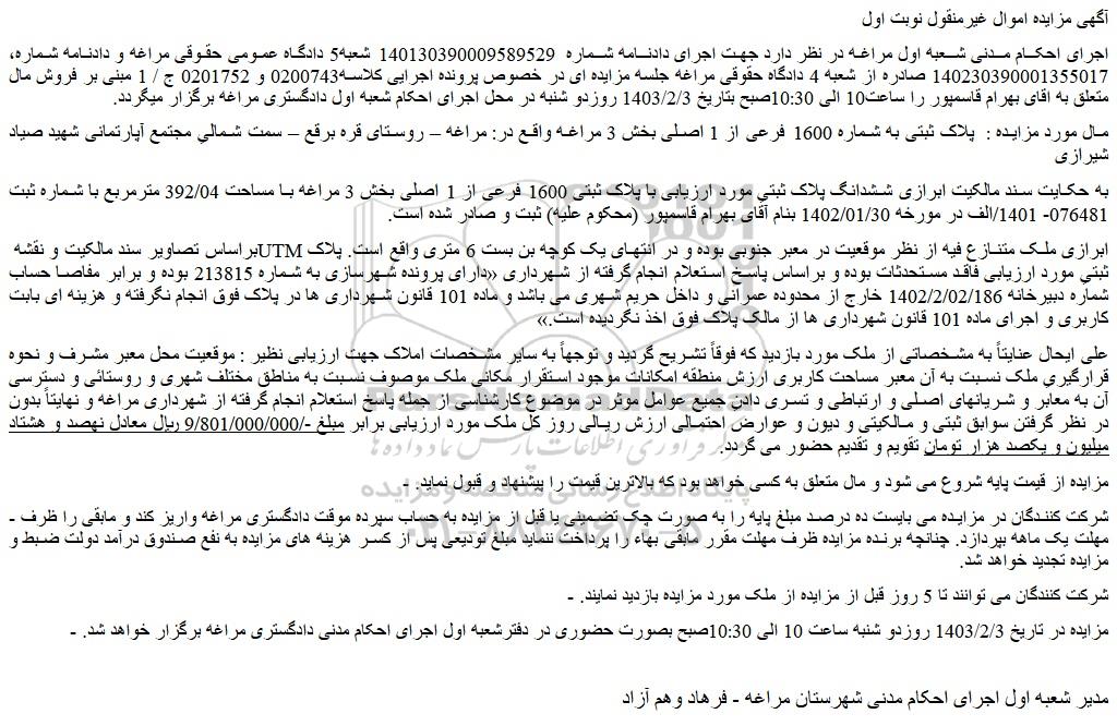 - مزایده در تاریخ 1403/2/3 روزدو شنبه ساعت 10 الی 10:30صبح بصورت حضوری در دفترشعبه اول اجرای احکام مدنی دادگستری مراغه برگزار خواهد شد.