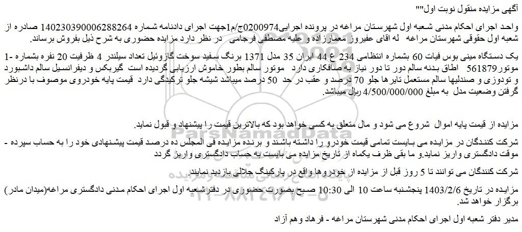 مزایده در تاریخ 1403/2/6 پنجشنبه ساعت 10 الی 10:30 صبح بصورت حضوری در دفترشعبه اول اجرای احکام مدنی دادگستری مراغه(میدان مادر) برگزار خواهد شد.