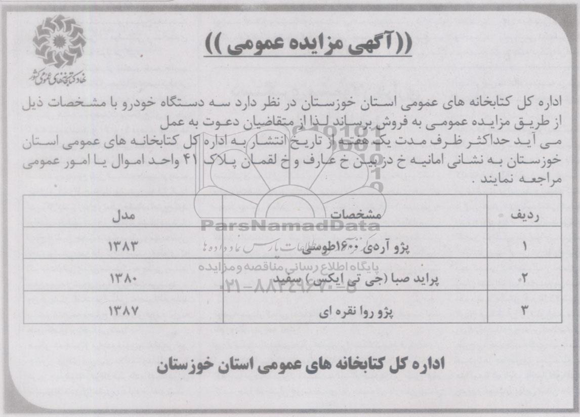 اداره کل کتابخانه های عمومی استان خوزستان در نظر دارد سه دستگاه خودرو با مشخصات ذیل از طریق مزایده عمومی به فروش برساند. لذا از متقاضیان دعوت می شود حداکثر ظرف مدت یک هفته از تاریخ انتشار اگهی به اداره کل کتابخانه های عمومی استان خوزستان به نشانی امانیه- خ دز بین خ عارف و خ لقمان پلاک 41 واحد اموال یا امور عمومی مراجعه نمایند.