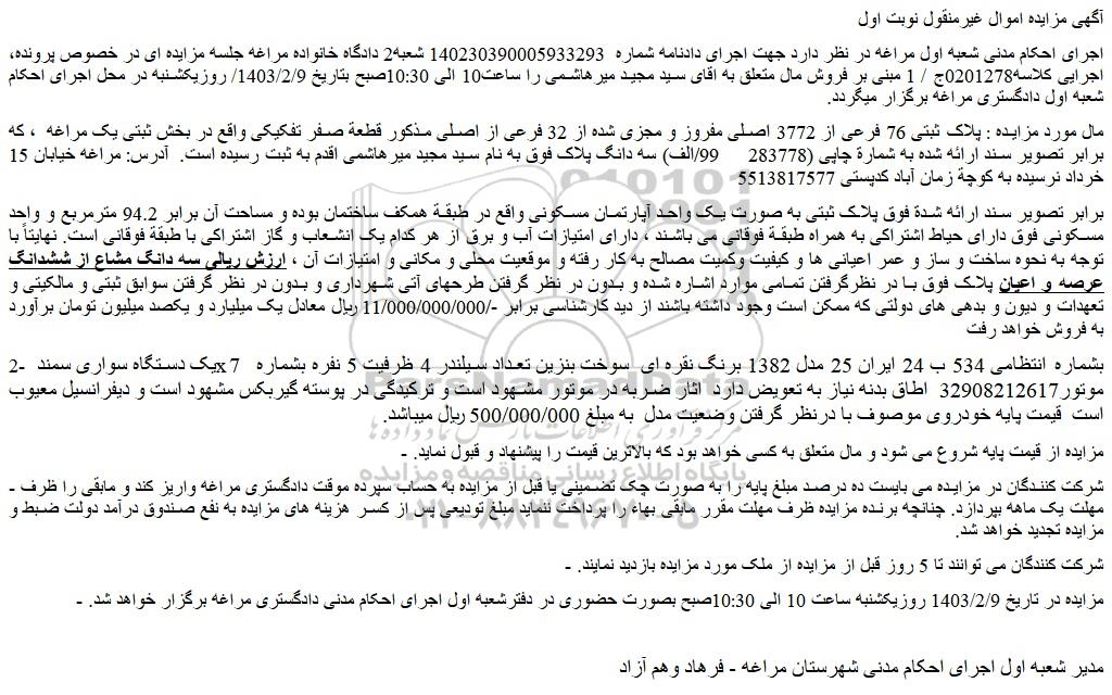 - مزایده در تاریخ 1403/2/9 روزیکشنبه ساعت 10 الی 10:30صبح بصورت حضوری در دفترشعبه اول اجرای احکام مدنی دادگستری مراغه برگزار خواهد شد.