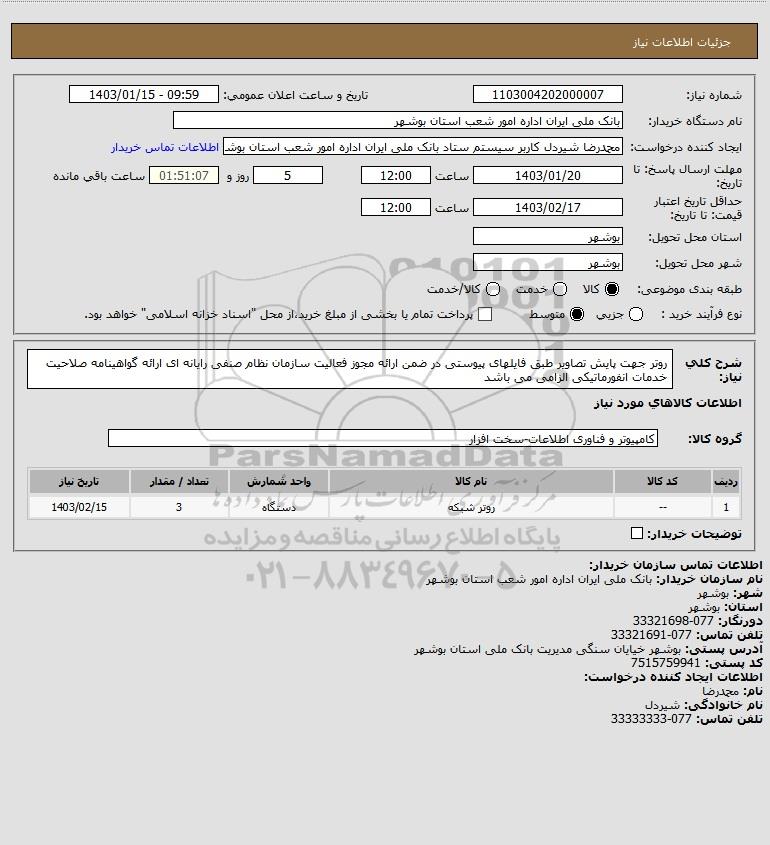 نام سازمان خریدار: بانک ملی ایران اداره امور شعب استان بوشهر