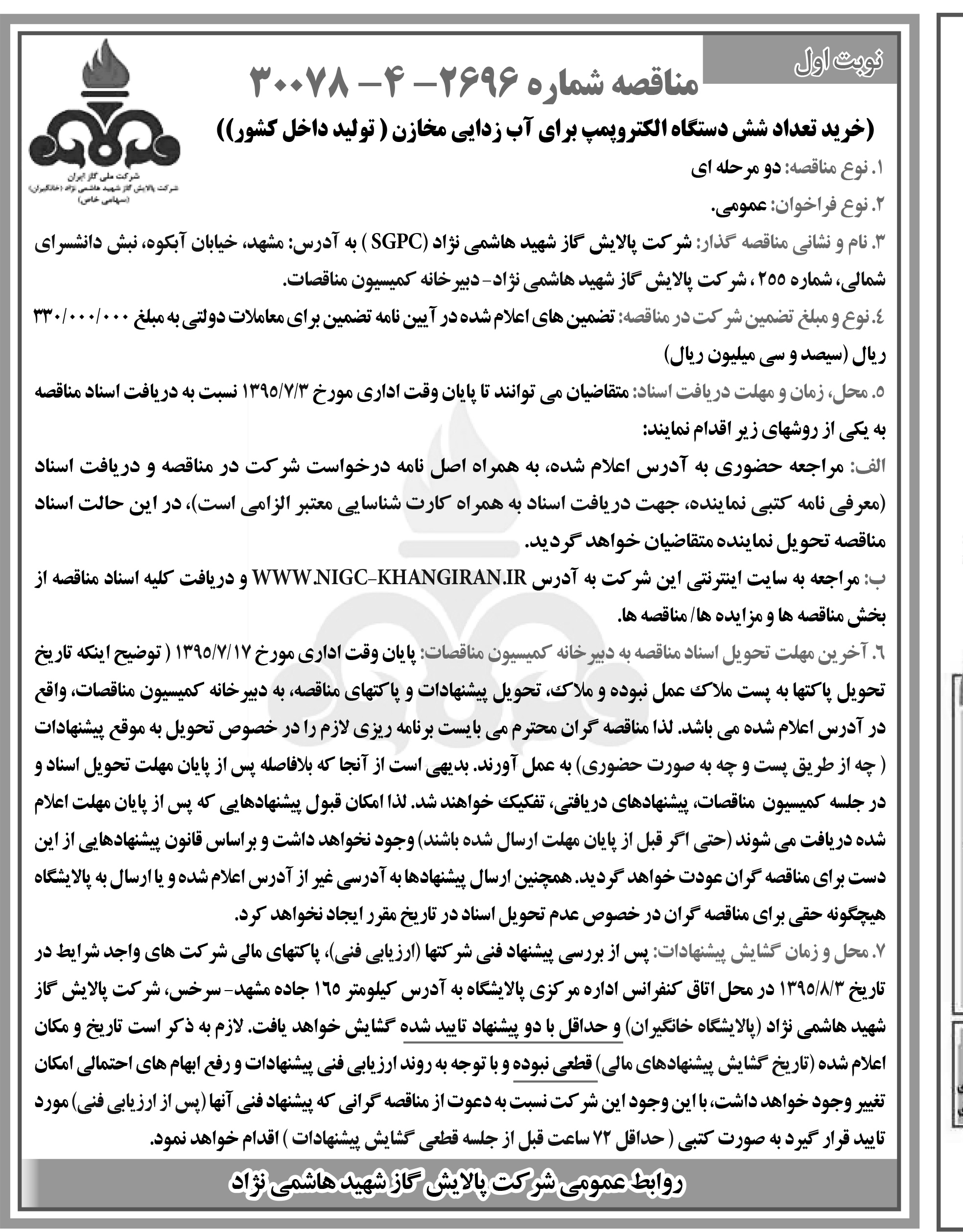 7-محل و زمان گشایش پیشنهادات: پس از بررسی پیشنهاد فنی شرکت ها - ارزیابی فنی - پاکتهای مالی شرکتهای واجد شرایط در تاریخ 95.8.3 در محل اتاق کنفرانس اداره مرکزی پالایشگاه به آدرس کیلومتر 165 جاده مشهد - سرخس شرکت پالایش گاز شهید هاشمی نژاد (پالایشگاه خانگیران و حداقل با دو پیشنهاد تایید شده گشایش خواهد یافت. لازم به ذکر است تاریخ و مکان اعلام شده - تاریخ گشایش پیشنهادهای مالی- قطعی نبوده و با توجه به روند ارزیابی فنی پیشنهادات و رفع ابهام های احتملای امکان تغییر وجود خواهد داشت. با این وجود شرکت نسبت به دعوت از مناقصه گرانی که پیشنهاد فنی آنها پس از ارزیابی فنی مورد تایید قرار گیرد به صورت کتبی - حداقل 72 ساعت قبل از جلسه قطعی گشایش پیشنهادات- اقدام خواهد نمود.