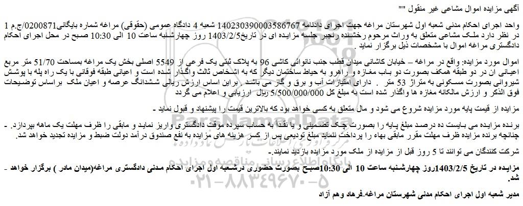 - مزایده در تاریخ 1403/2/5روز چهارشنبه ساعت 10 الی 10:30صبح بصورت حضوری درشعبه اول اجرای احکام مدنی دادگستری مراغه(میدان مادر ) برگزار خواهد شد.