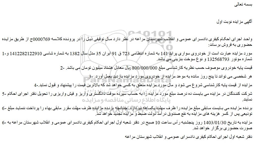 واحد اجرای احکام کیفری دادسرای عمومی و انقلاب شهرستان مراغه در نظر دارد مال توقیفی ذیل را در پرونده کلاسه 0000769ج از طریق مزایده حضوری به فروش برساند: