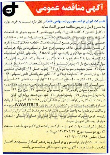 شرکت ایران ترانسفوری (سهامی عام) در نظر دارد نسبت به خرید موارد به شرح ذیل از طریق مناقصه عمومی اقدام نماید.