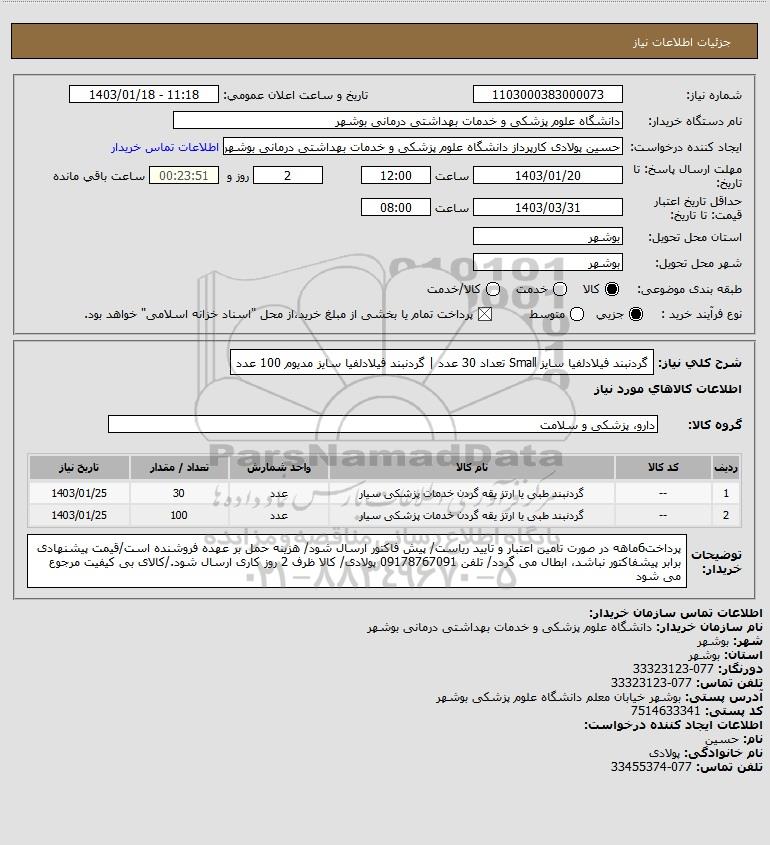 اسناد مناقصه استعلام گردنبند فیلادلفیا سایز Small تعداد 30 عدد | گردنبند فیلادلفیا سایز مدیوم 100 عدد به علت اتمام مهلت شرکت در مناقصه از روی وب سایت برداشته شده است. برای رویت اسناد جدید به صفحه اسناد مناقصه مزایده مراجعه کنید.