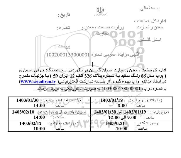 شرح مختصری از کالا اداره کل صنعت، معدن و تجارت استان گلستان در نظر دارد یک دستگاه خودرو سواری (پراید مدل 86 رنگ سفید به شماره پلاک 326 الف 12 ایران 59) با جزئیات مندرج در اسناد مزایده را بهره گیری از سامانه تدارکات الکترونیکی ستاد ایران با شماره مزایده 1002000133000001 به صورت الکترونیکی به فروش برساند.