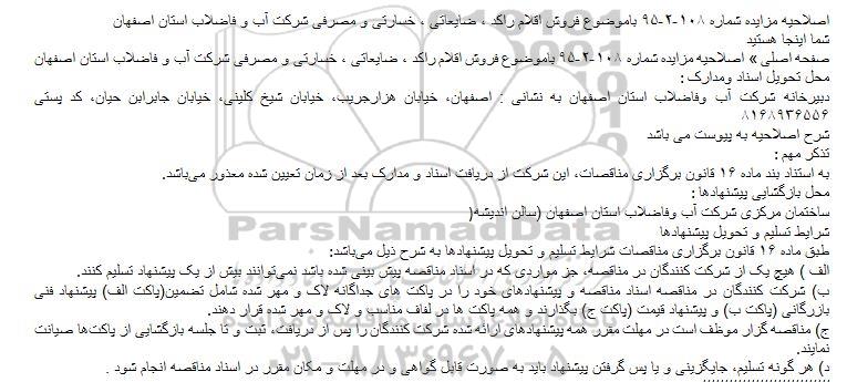اصلاحيه مزايده شماره 108-2-95 باموضوع فروش اقلام راكد ، ضایعاتی ، خسارتی و مصرفی شرکت آب و فاضلاب استان اصفهان