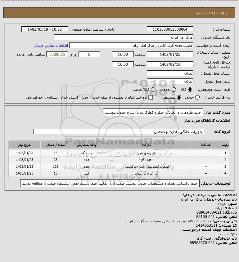 شرح کلی نیاز: خرید ملزومات و اتصالات چیلر و کولرگازی به شرح جدول پیوست