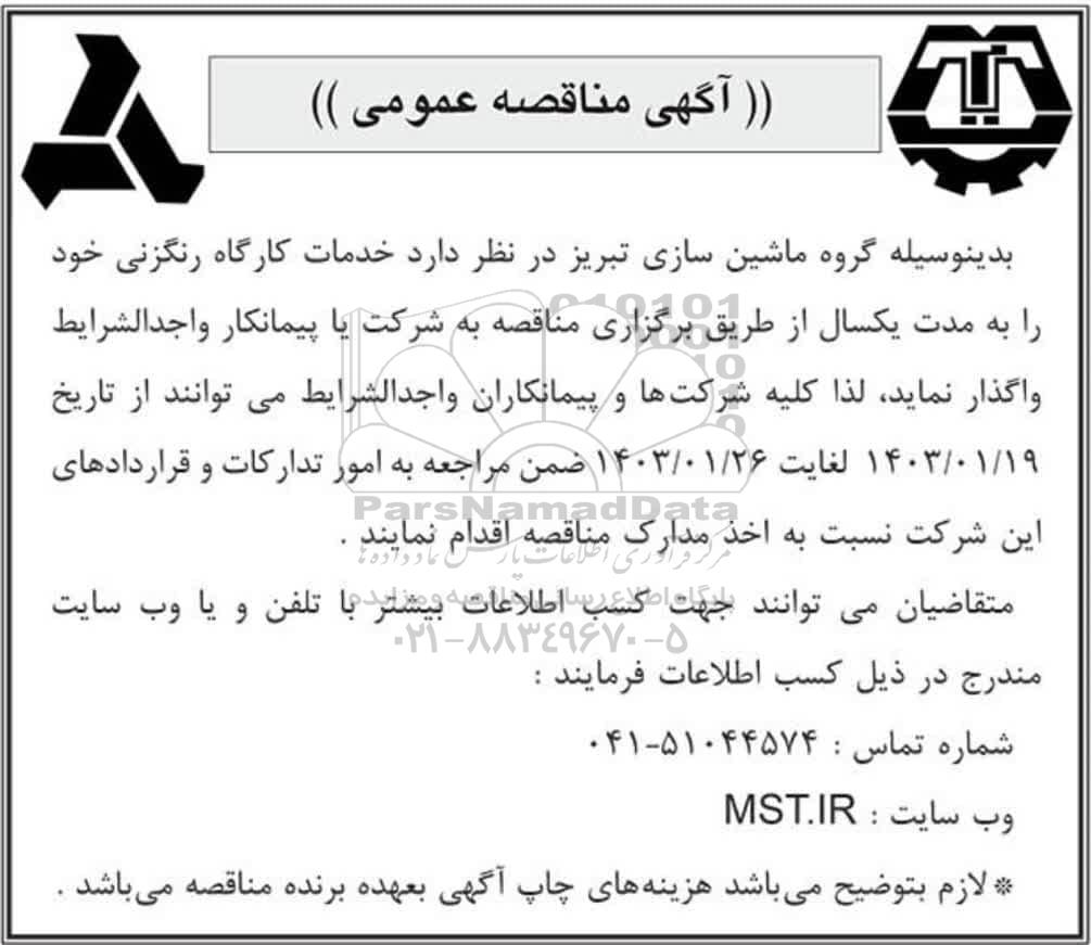 بدینوسیله گروه ماشین سازی تبریز (سهامی عام)در نظر دارد خدمات کارگاه رنگزنی خود را به مدت یکسال از طریق برگزاری مناقصه به شرکت یا پیمانکار واجدالشرایط واگذار نماید.