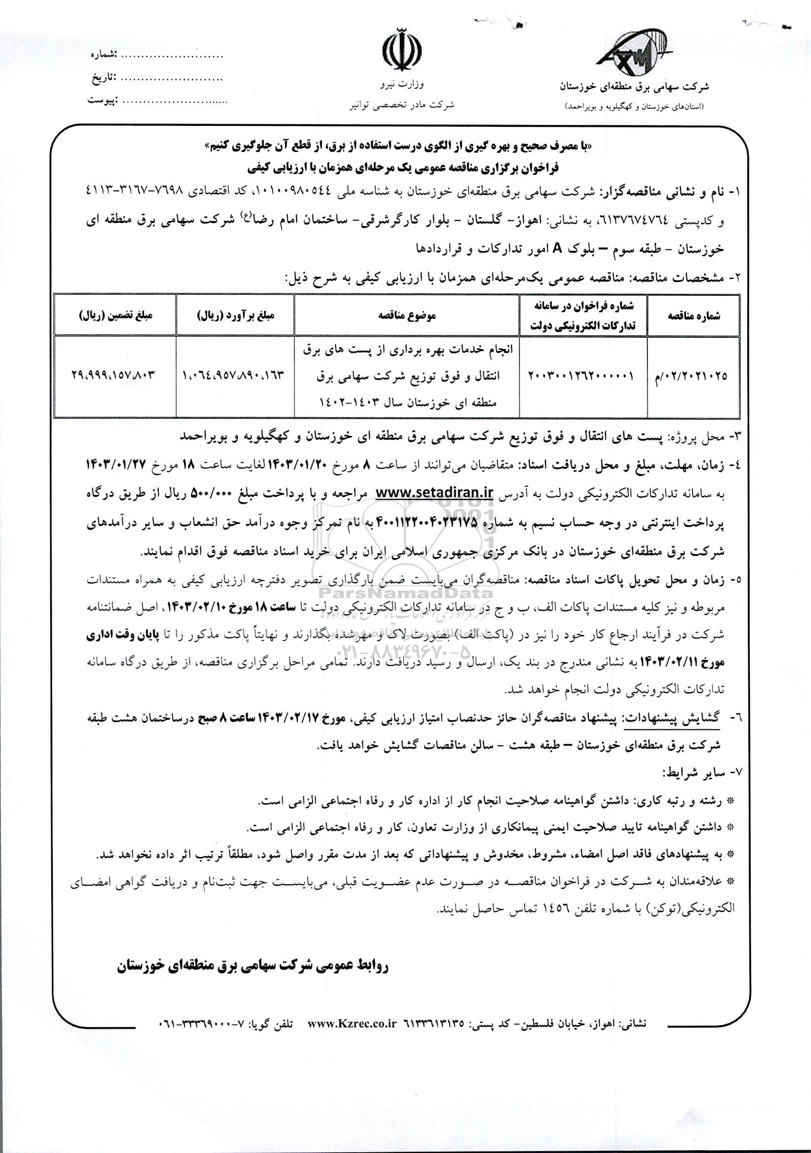 | 02/2021025/ م | 2003001262000001 | انجام خدمات بهره برداری از پست های برق انتقال و فوق توزیع شرکت سهامی برق منطقه ای خوزستان سال 1403-1402 | 1.064.957.890.163 | 29.999.157.803 |