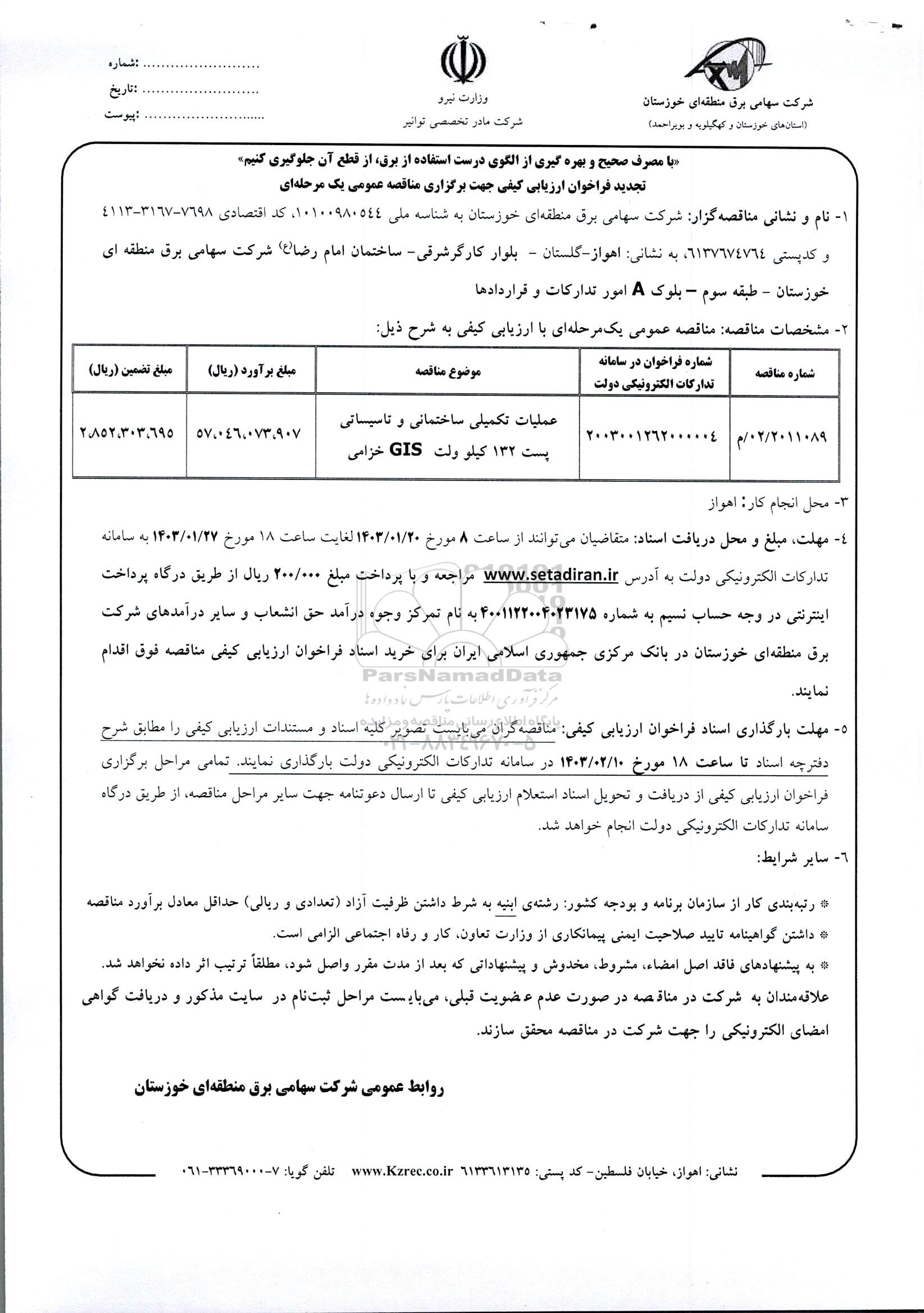| 02/2011089/ م | 2003001262000004 | عملیات تکمیلی ساختمانی و تاسیساتی پست 132 کیوولت gis خزامی | 57.046.073.907 | 2.852.303.695 |