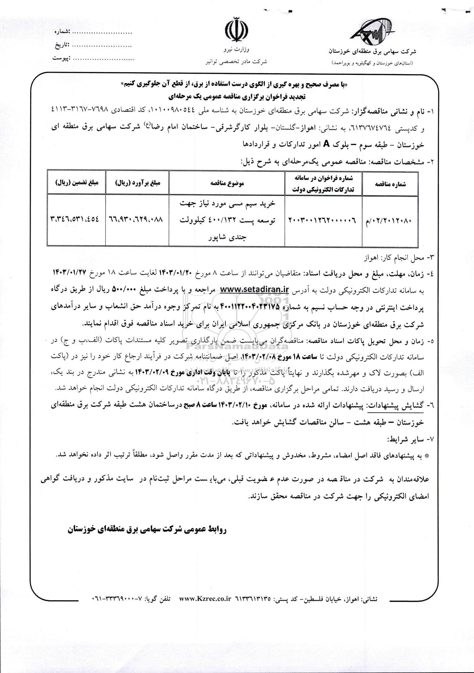 | 02/2012080 / م | 2003001262000006 | خرید سیم مسی مورد نیاز جهت توسعه پست 400.132 کیلوولت جندی شاپور |