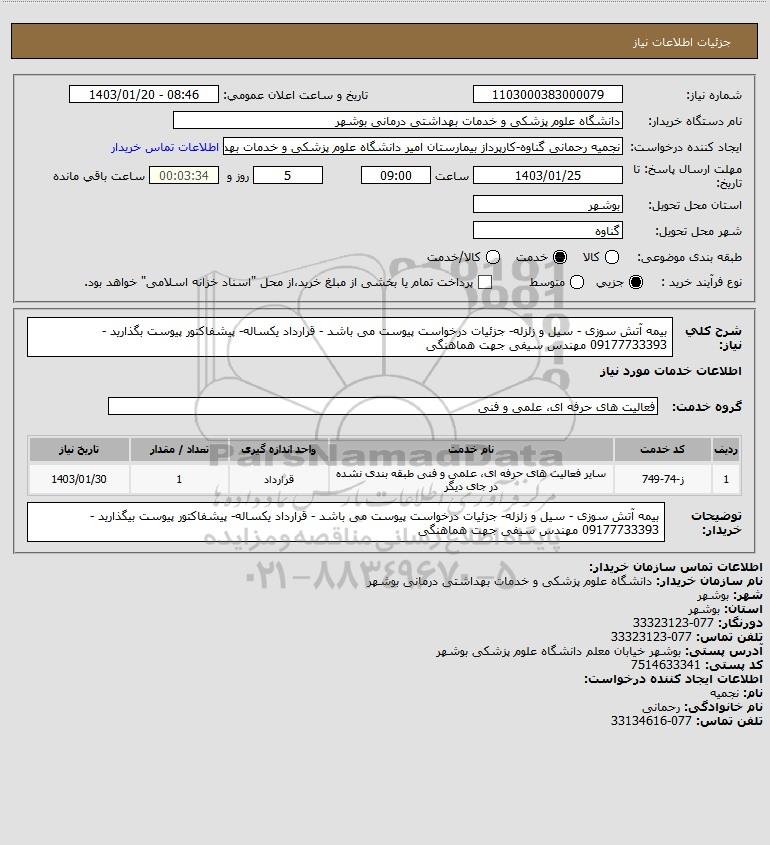شرح کلی نیاز: بیمه آتش سوزی - سیل و زلزله- جزئیات درخواست پیوست می باشد - قرارداد یکساله- پیشفاکتور پیوست بگذارید -09177733393 مهندس سیفی جهت هماهنگی