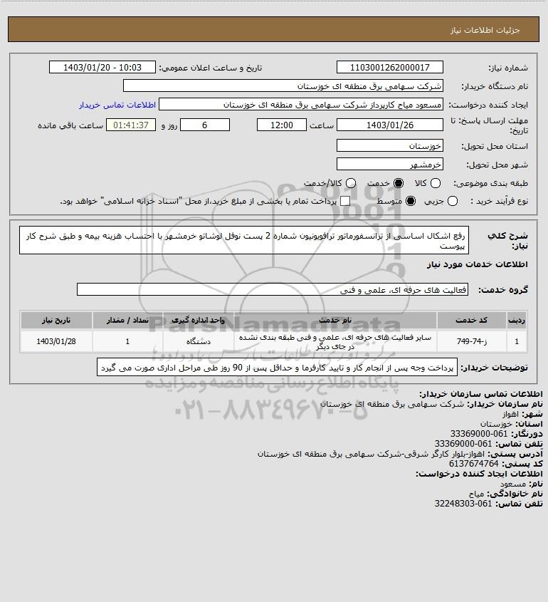 شرح کلی نیاز: رفع اشکال اساسی از ترانسفورماتور ترافویونیون شماره 2 پست نوفل لوشاتو خرمشهر با احتساب هزینه بیمه و طبق شرح کار پیوست
