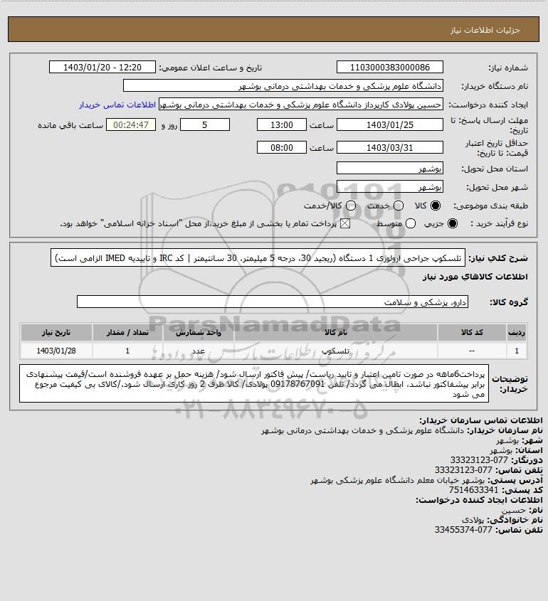 استعلام بها و موضوع استعلام استعلام تلسکوپ جراحی ارولوژی 1 دستگاه (ریجید 30، درجه 5 میلیمتر، 30 سانتیمتر | کد IRC و تاییدیه IMED الزامی است) به اطلاع کلیه شرکتها و افراد متخصص واجد شرایط میرساند، آگهی گذار در نظر دارد از طریق استعلام بها، نسبت به انتخاب و دریافت پیشنهادات اقدام نماید. این استعلام با کد آگهی ثبت شده در سامانه خبرگزاری پارس نماد : 7263012 منتشر شده است. مشخصات استعلام : تاریخ شروع استعلام: 1403/01/20 آخرین مهلت ارسال پیشنهاد قیمت : 1403/01/25 و محل اجرای پروژه : استان بوشهر میباشد. استعلام قیمت مورد درخواست : استعلام تلسکوپ جراحی ارولوژی 1 دستگاه (ریجید 30، درجه 5 میلیمتر، 30 سانتیمتر | کد IRC و تاییدیه IMED الزامی است) با دستهبندیهای تخصصی و گروه های مرتبط : خدمات و تجهیزات آزمایشگاهی و پزشکی, استعلام اطلاع رسانی میگردد.