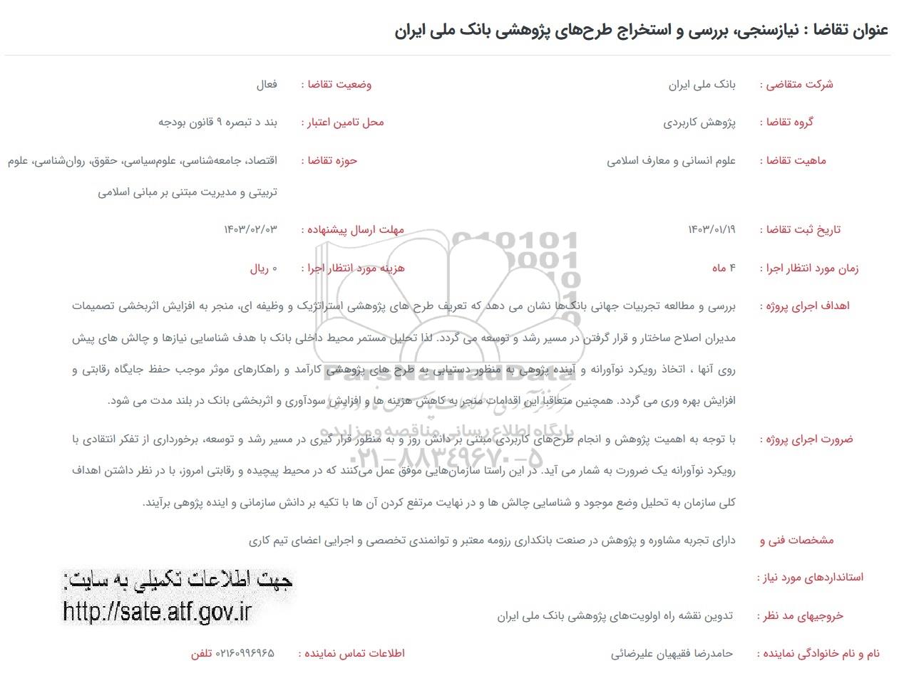 عنوان تقاضا : نیازسنجی، بررسی و استخراج طرح های پژوهشی بانک ملی ایران