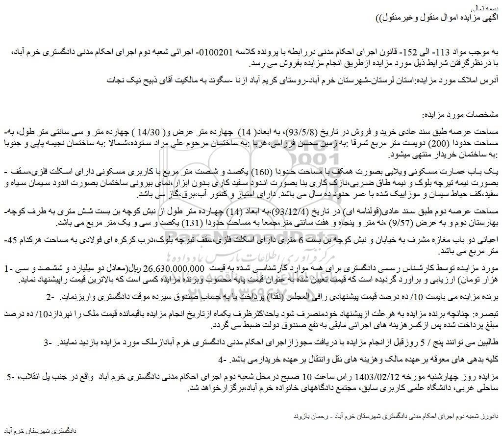 به موجب مواد 113- الی 152- قانون اجرای احکام مدنی دررابطه با پرونده کلاسه 0100201- اجرائی شعبه دوم اجرای احکام مدنی دادگستری خرم آباد، با درنظرگرفتن شرایط ذیل مورد مزایده ازطریق انجام مزایده بفروش می رسد.