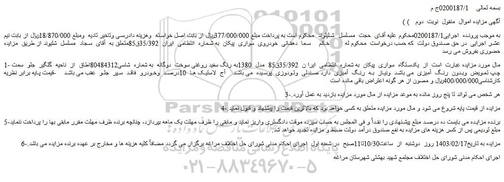 به موجب پرونده اجرایی0200187/1محکوم علیه آقای حجت مسلسل شلیلوند محکوم است به پرداخت مبلغ 377/000/000ریال از بابت اصل خواسته وهزینه دادرسی وتاخیر تادیه ومبلغ 18/870/000ریال از بابت نیم عشر اجرایی در حق صندوق دولت که حسب درخواست محکوم له خانم سما دهقانی خودروی سواری پیکان به شماره انتظامی ایران 35/392ق85متعلق به آقای سجاد مسلسل شلیوند از طریق مزایده حضوری بفروش می رسد