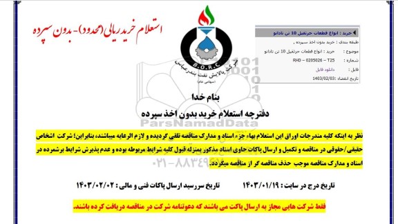 تاریخ درج در سایت : 1403.1.19 تاریخ سررسید ارسال پاکات فنی و مالی : 1403.2.2
