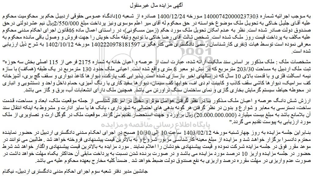 به موجب اجرائیه شماره 140007420000237303 مورخه 1400/12/24 صادره از شعبه 10دادگاه عمومی حقوقی اردبیل حکم بر محکومیت محکوم علیه آقای جلیل خاکی به تحویل ملک موضوع خواسته در حق محکوم له آقای میر اعلم موسوی ونیز پرداخت مبلغ 2/550/000ریال نیم عشردولتی درحق صندوق دولت صادر شده است. نظر به عدم امکان تحویل ملک مورد حکم (زمین مسکونی)، در راستای اعمال ماده 46قانون اجرای احکام مدنی محکوم علیه مکلف به پرداخت قیمت روز ملک شده است. شخص ثالث آقای رضا خاکی با تودیع وثیقه ملک خویش را جهت فروش و وصول باقی مانده محکوم به معرفی نموده است توسط هیات 3نفری کارشناسان رسمی دادگستری طی کدرهگیری 1402220978181597 مورخه 1402/10/12 به شرح ذیل ارزیابی شده است.