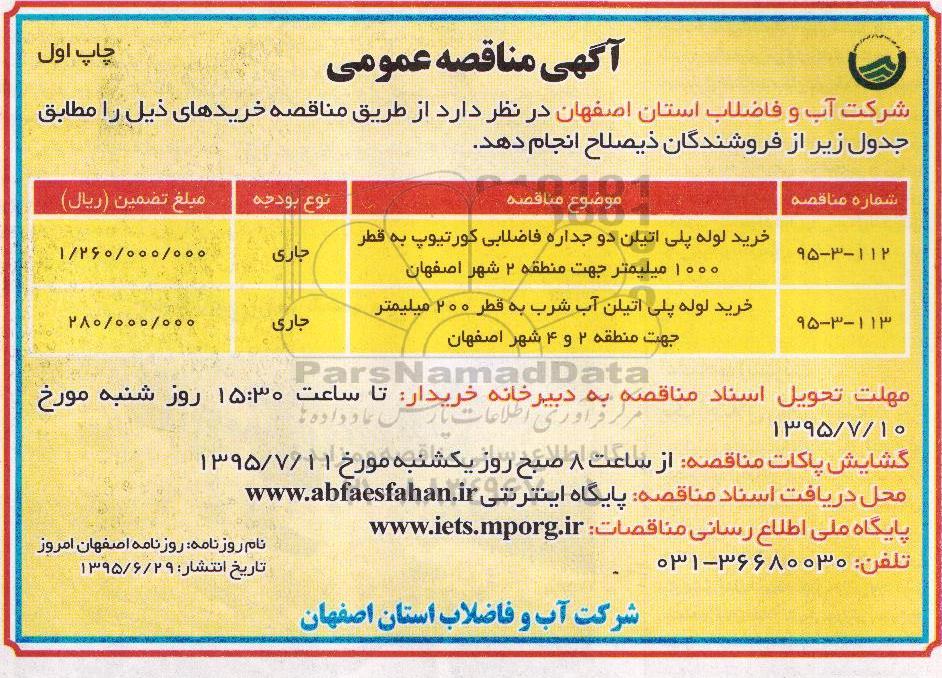 | 95-3-113 | خرید لوله پلی اتیلن آب شرب به قطر 200 میلیمتر جهت منطقه 2 و 4 شهر اصفهان |