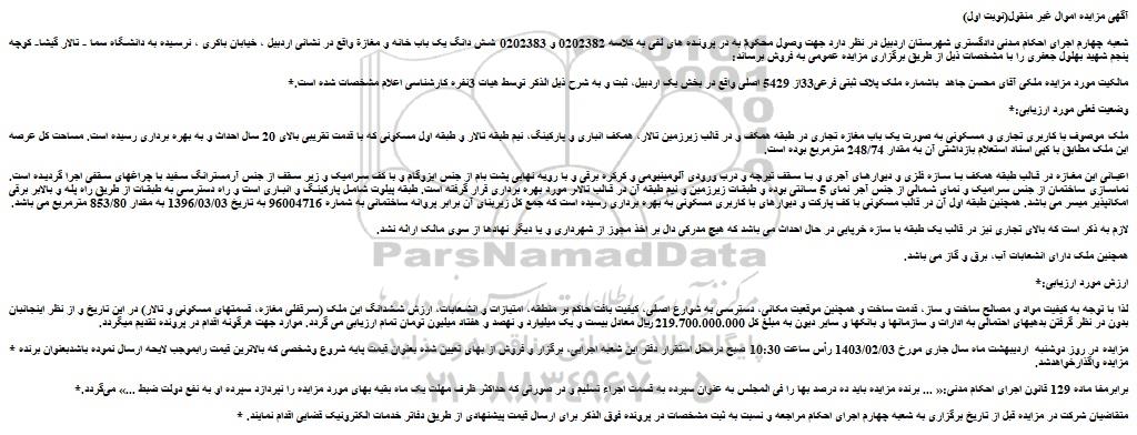 * مزایده در روز دوشنبه اردیبهشت ماه سال جاری مورخ 1403/02/03 رأس ساعت 10:30 صبح درمحل استقرار دفتر این شعبه اجرایی، برگزار و فروش از بهای تعیین شده بعنوان قیمت پایه شروع وشخصی که بالاترین قیمت رابموجب لایحه ارسال نموده باشدبعنوان برنده مزایده واگذارخواهدشد.