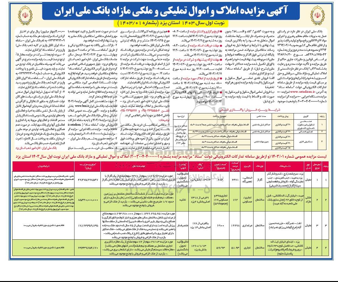 آگهی مزایده املاک و اموال تملیکی و ملکی مازاد بانک ملی ایران