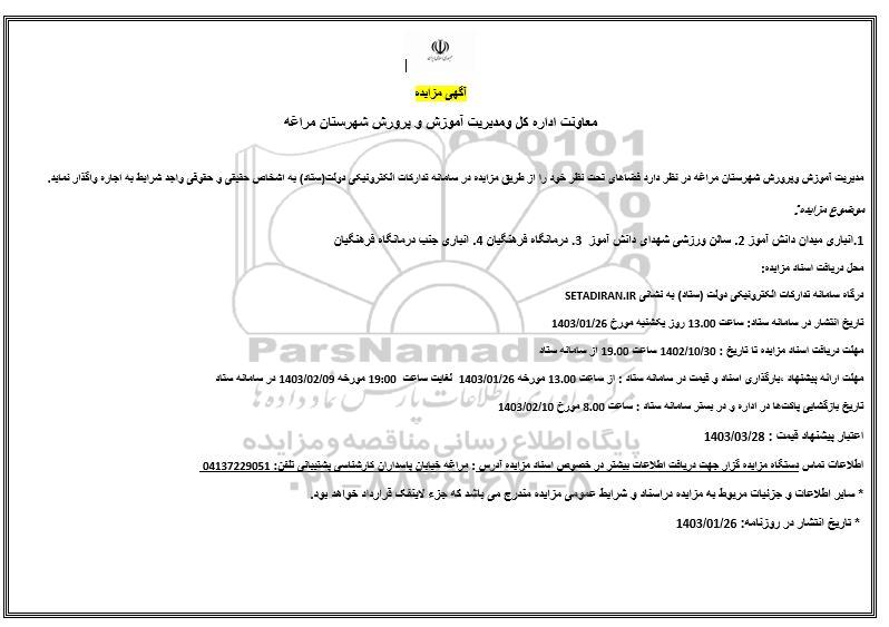 مدیریت آموزش وپرورش شهرستان مراغه در نظر دارد فضاهای تحت نظر خود را از طریق مزایده در سامانه تدارکات الکترونیکی دولت (ستاد) به اشخاص حقیقی و حقوقی واجد شرایط به اجاره واگذار نماید.