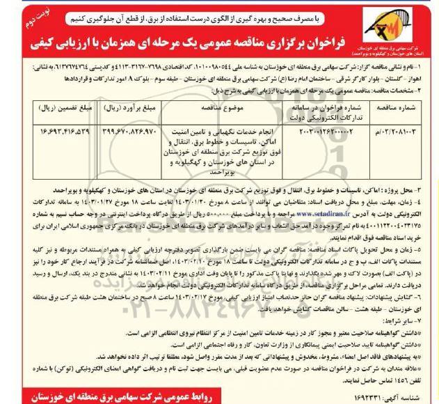 | 02/2081003/ م | 2003001262000002 | انجام خدمات نگهبانی و تامین امنیت اماکن، تاسیسات و خطوط برق، انتقال و فوق توزیع شرکت برق منطقه ای خوزستان در استان های خوزستان و کهگیلویه و بویراحمد | 399.670.826.970 | 16.693.416.539 |