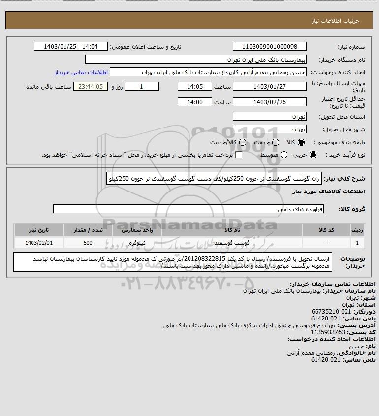 شرح کلی نیاز: ران گوشت گوسفندی نر جوون 250کیلو/کف دست گوشت گوسفندی نر جوون 250کیلو