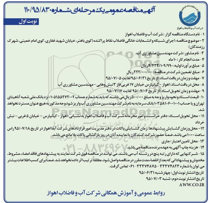 مناقصه اجرای شبکه و انشعابات خانگی فاضلاب نقاط پراکنده- 95.06.31 از کلیه افراد متخصص و شرکتها واجد شرایط دعوت به عمل میآید در مناقصه با کد خبرگزاری پارس نماد: 727611 شرکت نمایند.