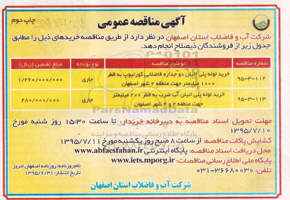 | 95-3-113 | خرید لوله پلی اتیلن آب شرب به قطر 200 میلیمتر جهت منطقه 2 و 4 شهر اصفهان |