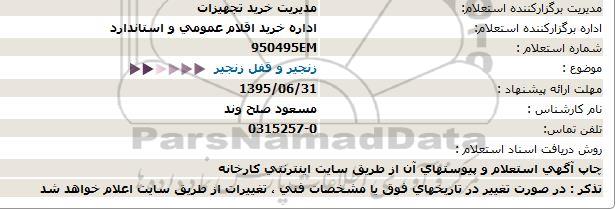 استعلام بها و موضوع استعلام استعلام,استعلام زنجیر و قفل زنجیر به اطلاع کلیه شرکتها و افراد متخصص واجد شرایط میرساند، آگهی گذار در نظر دارد از طریق استعلام بها، نسبت به انتخاب و دریافت پیشنهادات اقدام نماید. این استعلام با کد آگهی ثبت شده در سامانه خبرگزاری پارس نماد : 727760 منتشر شده است. مشخصات استعلام : تاریخ شروع استعلام: 1395/06/31 آخرین مهلت ارسال پیشنهاد قیمت : 1395/06/31 و محل اجرای پروژه : استان اصفهان میباشد. استعلام قیمت مورد درخواست : استعلام,استعلام زنجیر و قفل زنجیر با دستهبندیهای تخصصی و گروه های مرتبط : ابزار و یراق آلات, زنجیر صنعتی, استعلام اطلاع رسانی میگردد.