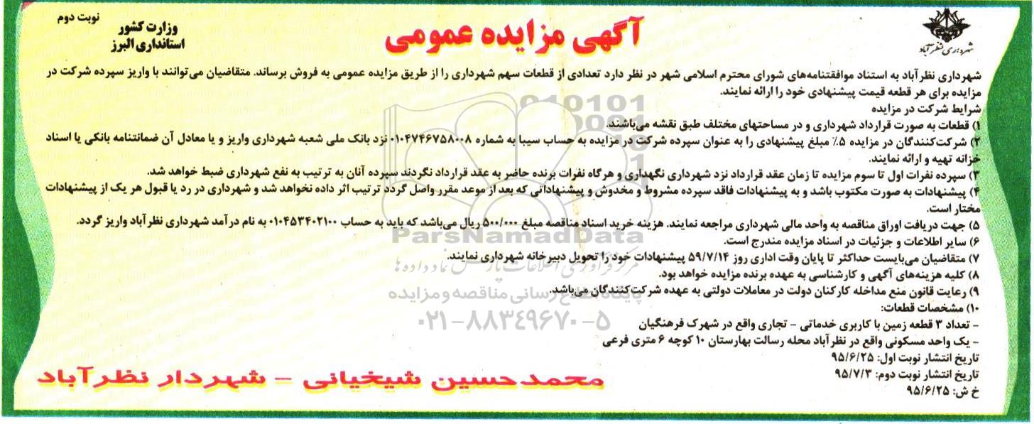 مزایده عمومی مزایده فروش تعدادی از قطعات سهم شهرداری نوبت دوم برگزار میگردد. از کلیه افراد متخصص و شرکتهای واجد شرایط دعوت به عمل میآید تا در این مزایده با کد خبرگزاری پارس نماد : 728277 شرکت نمایند تاریخ شروع مزایده : 1395/07/03 مهلت شرکت در مزایده: تا پایان روز 1395/07/14 مکان برگزاری اموال واگذاری استانهای البرز و دستهبندیهای مربوط به این حراجی املاک و زمین میباشد.