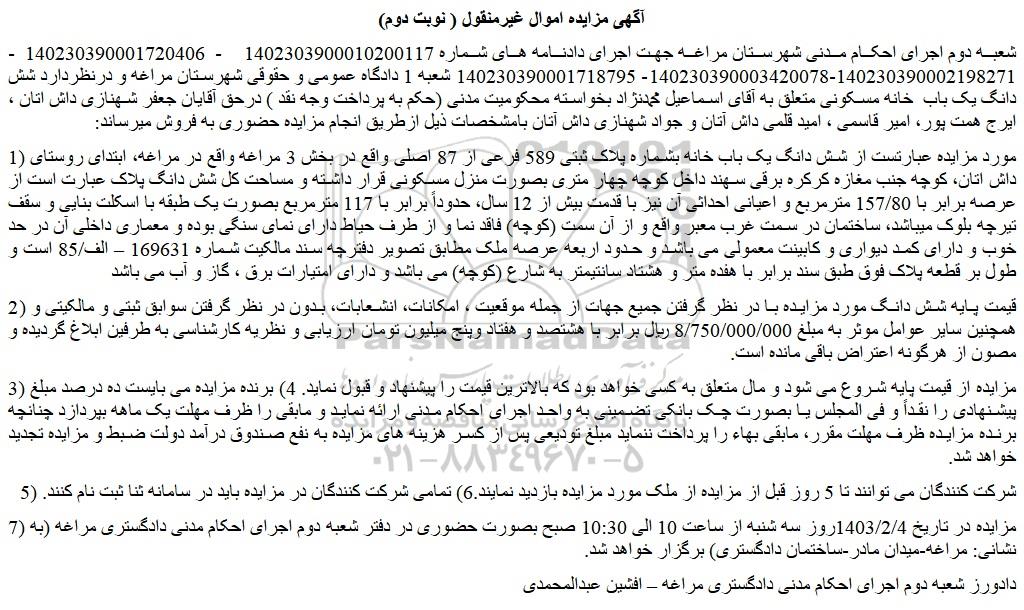 شعبه دوم اجرای احکام مدنی شهرستان مراغه جهت اجرای دادنامه های شماره 1402303900010200117 - 140230390001720406 - 140230390002198271-140230390003420078- 140230390001718795 شعبه 1 دادگاه عمومی و حقوقی شهرستان مراغه و درنظردارد شش دانگ یک باب خانه مسکونی متعلق به آقای اسماعیل محمدنژاد بخواسته محکومیت مدنی (حکم به پرداخت وجه نقد ) درحق آقایان جعفر شهنازی داش اتان ، ایرج همت پور، امیر قاسمی ، امید قلمی داش آتان و جواد شهنازی داش آتان بامشخصات ذیل ازطریق انجام مزایده حضوری به فروش میرساند: