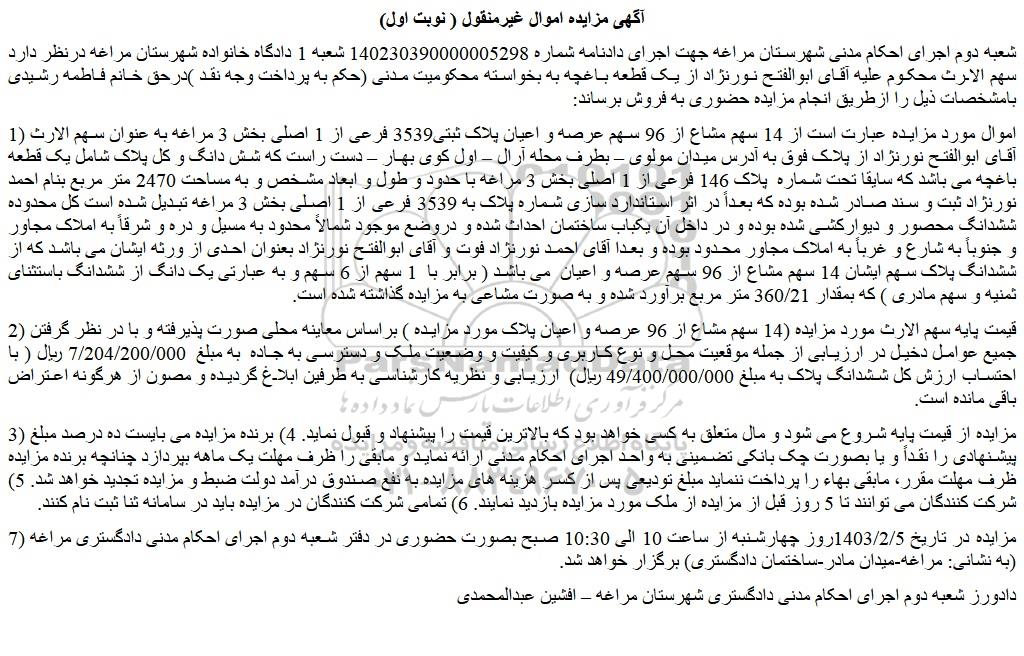 شعبه دوم اجرای احکام مدنی شهرستان مراغه جهت اجرای دادنامه شماره 140230390000005298 شعبه 1 دادگاه خانواده شهرستان مراغه درنظر دارد سهم الارث محکوم علیه آقای ابوالفتح نورنژاد از یک قطعه باغچه به بخواسته محکومیت مدنی (حکم به پرداخت وجه نقد )درحق خانم فاطمه رشیدی بامشخصات ذیل را ازطریق انجام مزایده حضوری به فروش برساند: