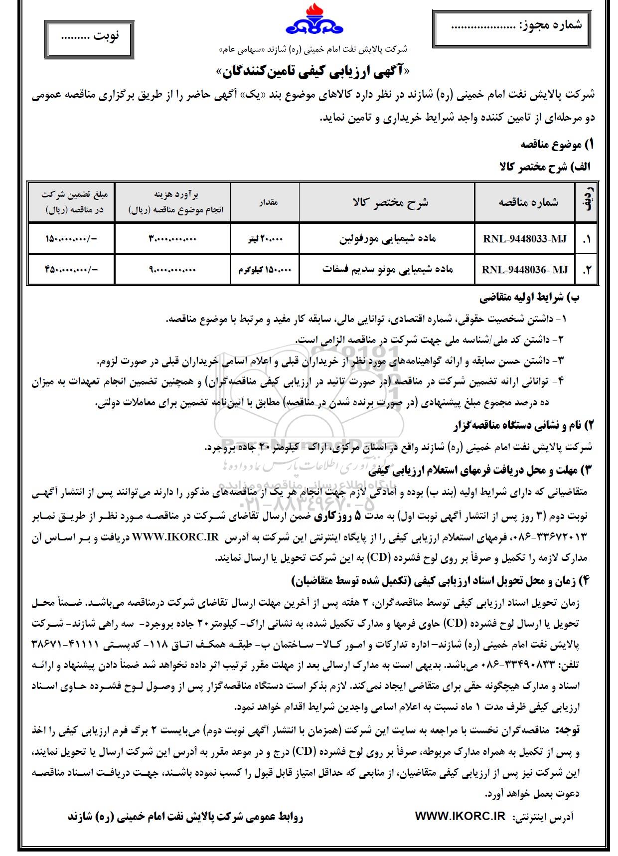 شرکت پالایش نفت امام خمینی (ره) شازند در نظر دارد کالاهای موضوع بند یک آگهی حاضر را از طریق برگزاری مناقصه عمومی دو مرحله ای از تأمین کننده واجد شرایط خریداری و تأمین نماید.