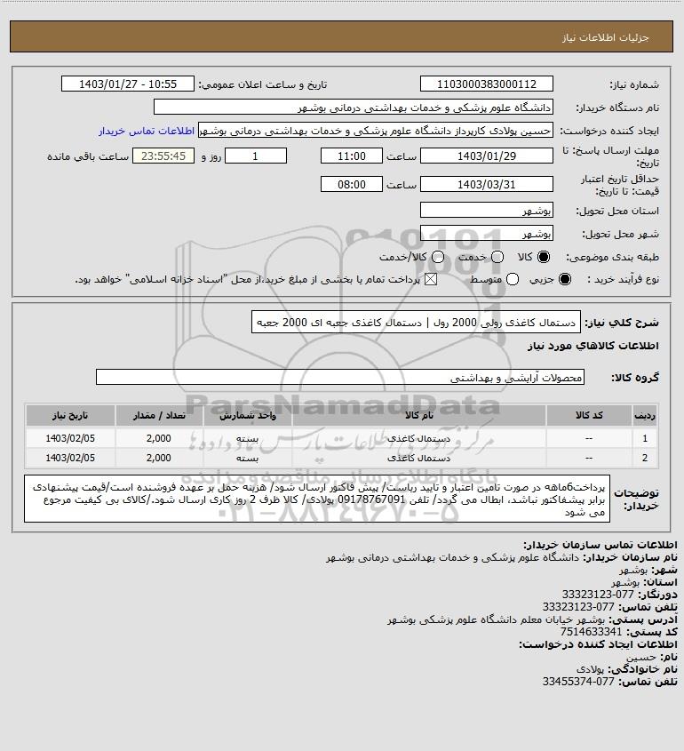 | 2 | -- | دستمال کاغذی | بسته | 2,000 | 1403/02/05 |