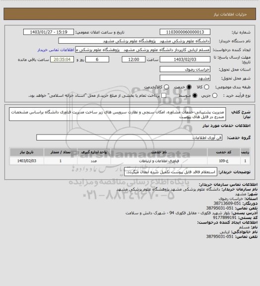 شرح کلی نیاز: مدیریت پشتیبانی-خدمات مشاوره، امکان سنجی و نظارت سرویس های زیر ساخت مدیریت فناوری دانشگاه براساس مشخصات مندرج در فایل های پیوست