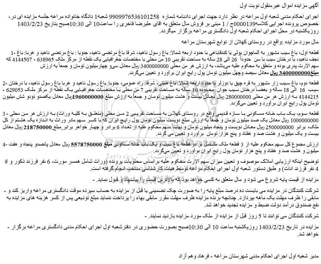 مال مورد مزایده :واقع در روستای کهلان از توابع شهرستان مراغه