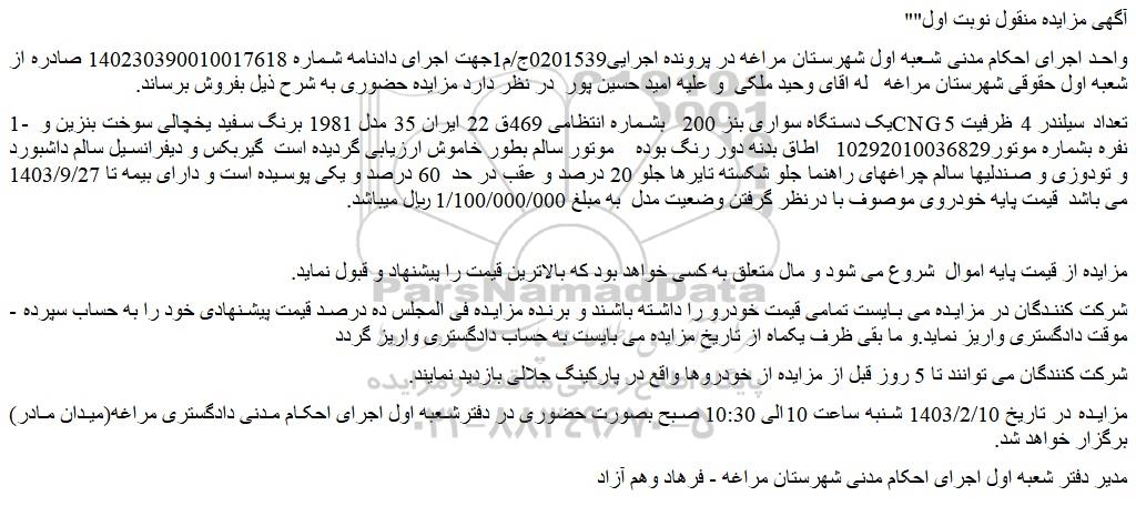 مزایده در تاریخ 1403/2/10 شنبه ساعت 10الی 10:30 صبح بصورت حضوری در دفترشعبه اول اجرای احکام مدنی دادگستری مراغه(میدان مادر) برگزار خواهد شد.