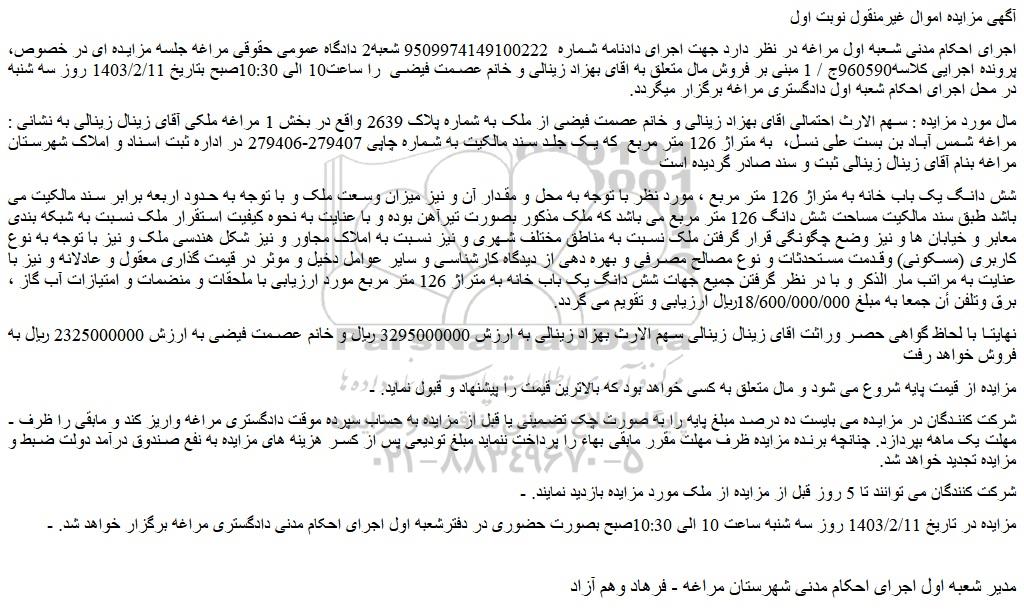 مال مورد مزایده : سهم الارث احتمالی اقای بهزاد زینالی و خانم عصمت فیضی از ملک به شماره پلاک 2639 واقع در بخش 1 مراغه ملکی آقای زینال زینالی به نشانی : مراغه شمس آباد بن بست على نسل، به متراژ 126 متر مربع که یک جلد سند مالکیت به شماره چاپی 279407-279406 در اداره ثبت اسناد و املاک شهرستان مراغه بنام آقای زینال زینالی ثبت و سند صادر گردیده است