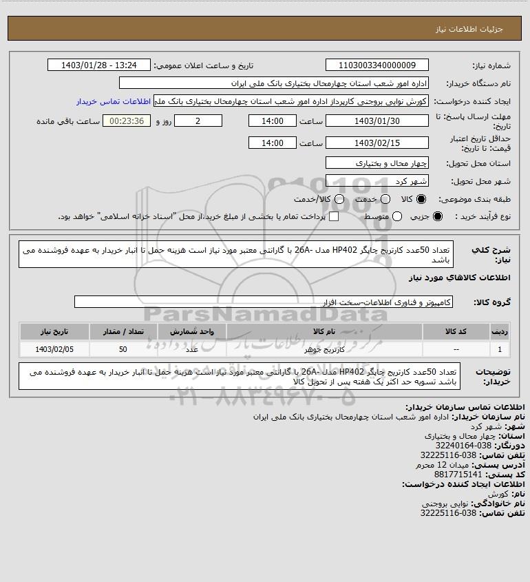 شرح کلی نیاز: تعداد 50عدد کارتریج چاپگر HP402 مدل -26A با گارانتی معتبر مورد نیاز است هزینه حمل تا انبار خریدار به عهده فروشنده می باشد